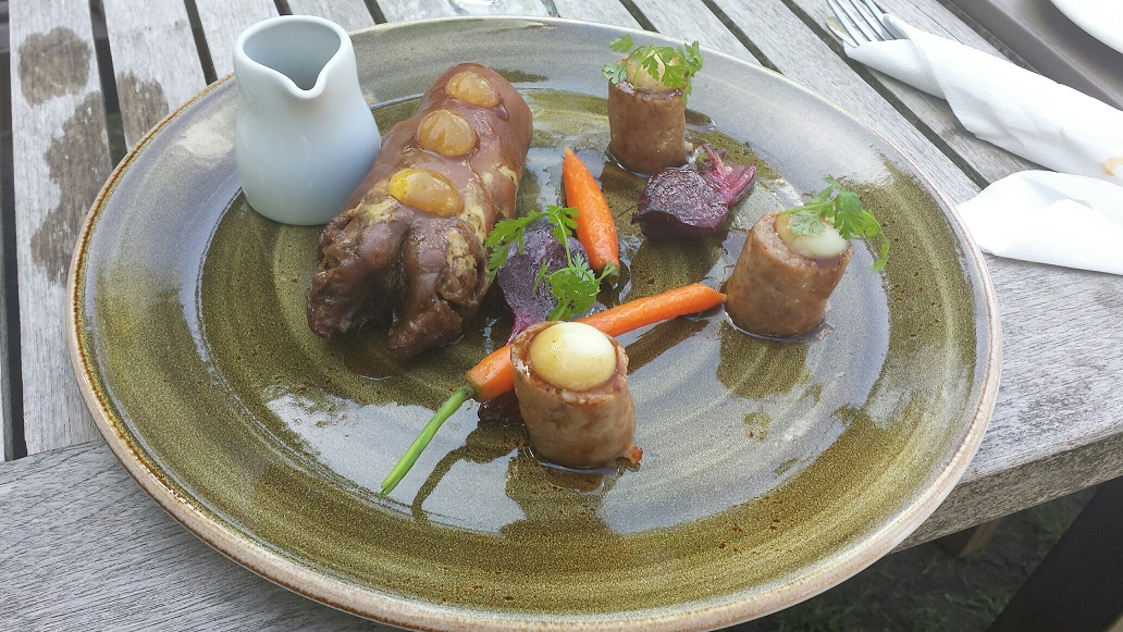 Wood pigeon was cooked perfectly. (Grandiose statement, but true.) The blood pudding ‘sausage rolls’ that came with it could/should be eaten by the dozen. (£7)