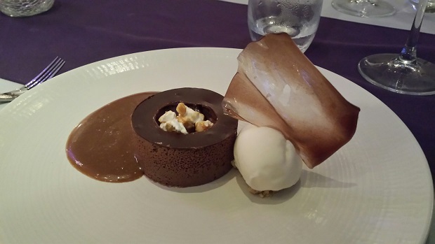 The rhubarb in the first of a couple of puddings was from Yorkshire, we were told. And once we’d dabbed the proud but homesick tear from the eye and had a quick rendition of ‘On Ilkley Moor Bar T’at’ we fully enjoyed its tartness with the cakey ginger parfait. Refreshing stuff.