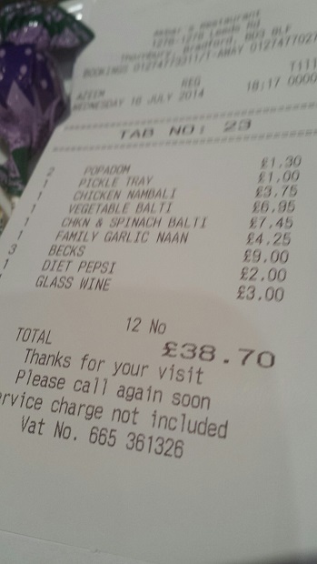 It looks like it used to think it was a bit posh, but it’s fraying around the edges now. That said, it’s more contemporary than some of the more traditional/older places we’ll visit. You don’t go for a Bradford curry to be wowed by the look of a place, though. It defeats the object.