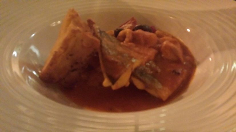“Delicately cooked” fish can sometimes be another way of saying “this stuff from the sea tastes of nowt”, but it wasn’t the case with these pieces of red snapper and sea bass, all firm, fresh and refined, and bobbing about in a tomato and olive broth. Tasty gear. (Drunken photo.)