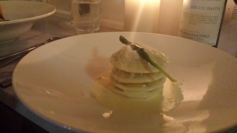 A generous pile of raviolo, filled with asparagus and mascarpone and each a little non-uniform to the next, had been rolled, cut and cooked by a sure hand. They had bite and body and showed how good a simple bowl of pasta should be. At these, we cooed. (Drunk but atmospheric photo.)