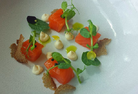 Meaty cubes of fresh smoked salmon were spritzed up with chive oil and punchy pea shoots. A simple showcase of some well-sourced produce.