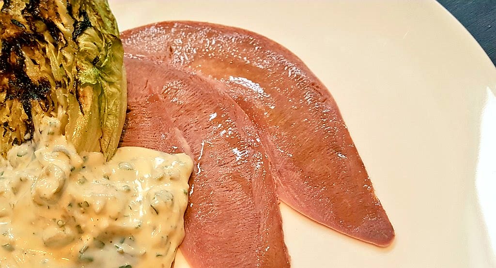 This plate of ox tongue, for example with a grebiche sauce (sauce grebiche, if we must) and a lump of charred lettuce might appear to be a simple ensemble but we’ve all tutted through enough Masterchef to know that with this kind of fodder “there’s nowhere to hide”.
