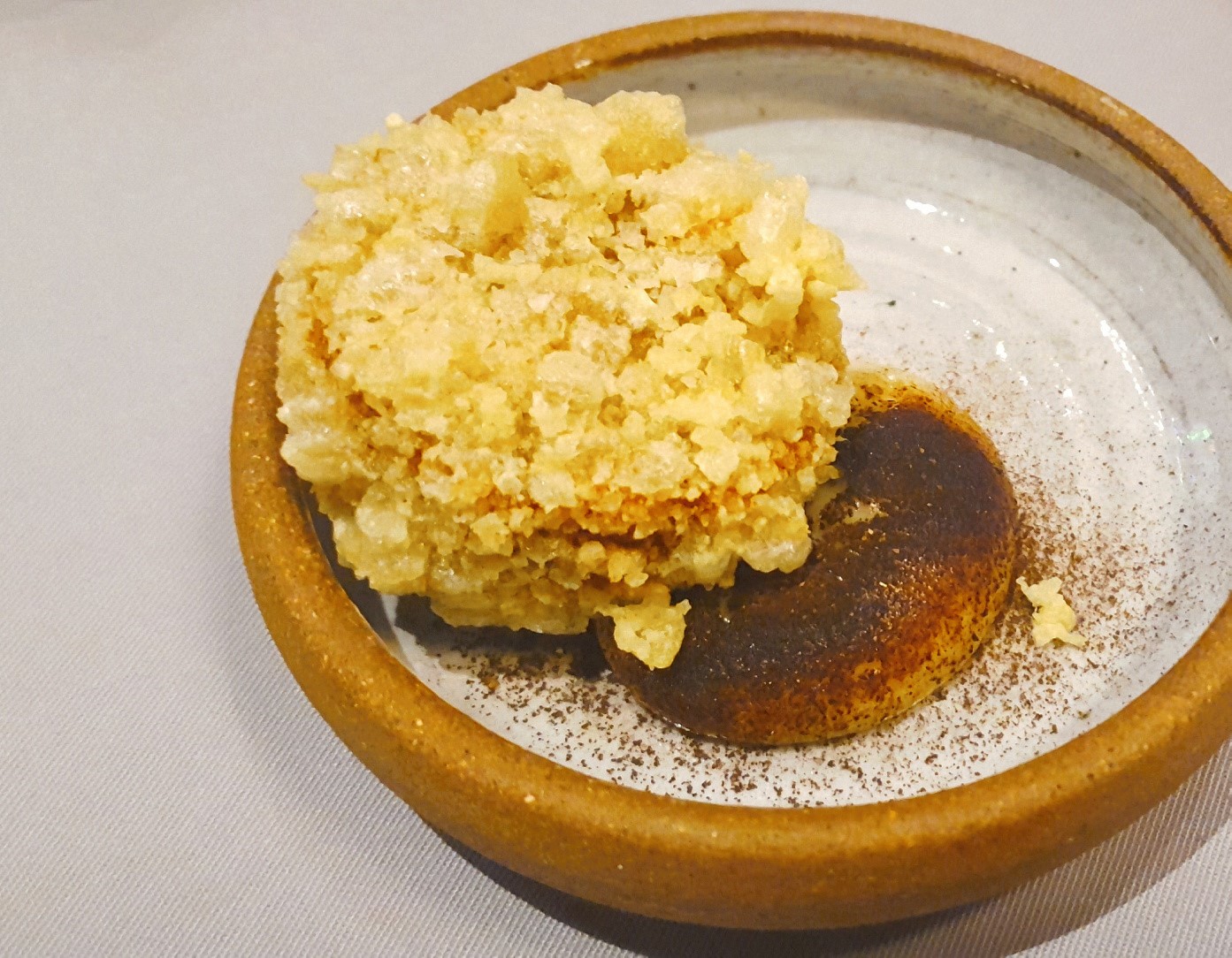 A couple of down-in-one “tacos”- one prawny, one scallopy, both spiked with bright, fresh herbs – were classy little morsels at £4 a throw. These arrived on a sheet of puffed rice flavoured to the bollocks with salt and vinegar, at which point I reflected that any chef this smitten with crisps is a kindred spirit of mine and can pretty much do no wrong.