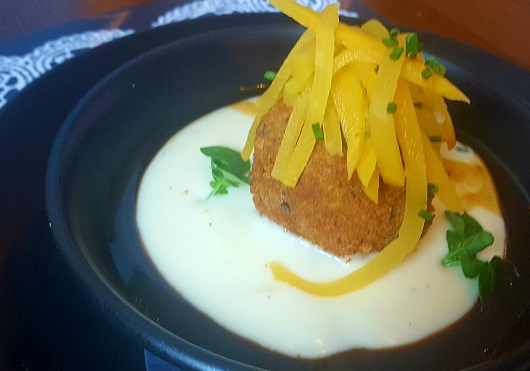 An orb of offaly haggis – I know, clock us tourists – comes with a can’t-put-my-finger-on-it ‘sauce’; potato veloute I reckon, smartly ticking the ‘tatties’ element while strands of swede – soz, ‘turnip’, soz, ‘neeps’ – complete the age-old ensemble.