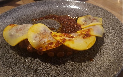 Pearly white octopus see-sawed texturally between crozzly roast spud (thin end) and plump, translucent scallop (fatter end). Didn’t get much of the pickle from the courgette but, well, it’s only courgette so no great loss. Probably had a summery glut.