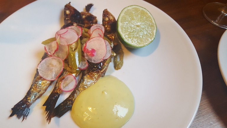 Three sardines, crozzled of skin, are next to land with a charred lime mayo and pickled chillies. Cracking stuff, with flavours and textures knocking about all over the plate, here. Seven exciting pounds worth.
