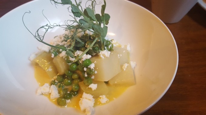 I could’ve had the Barnsley lamb chop a tad more pink, but it was, as Jamie says in every episode of every programme he makes, still “blushing”, and was a belting piece of meat. There must’ve been a courgette glut on Merseyside because here it is again, doing not very much, but there’s more of those fresh garden peas too so all’s well. (£13.)