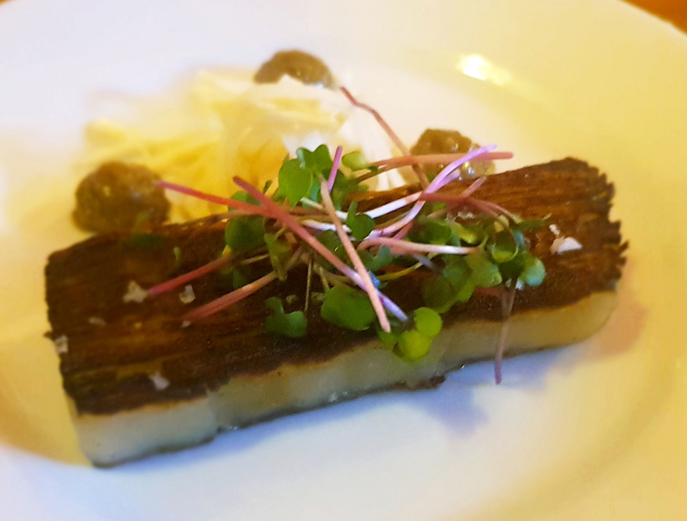A laser-accurate slab of uniformly layered potato has the homely aroma of hot chip (food not band) and comes with a well-done celeriac remoulade for crunch and cream.