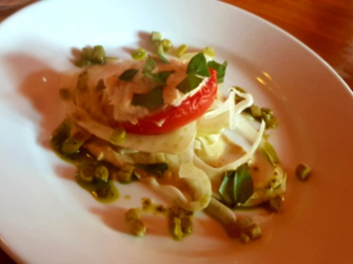 To ease us in there are ribbons of crunchy (and curried?) carrot with creamy ricotta; and confit tomato – for which it’d be remiss of me not to reference ‘the smell of summer’ – with the bright zip and crunch of fennel.