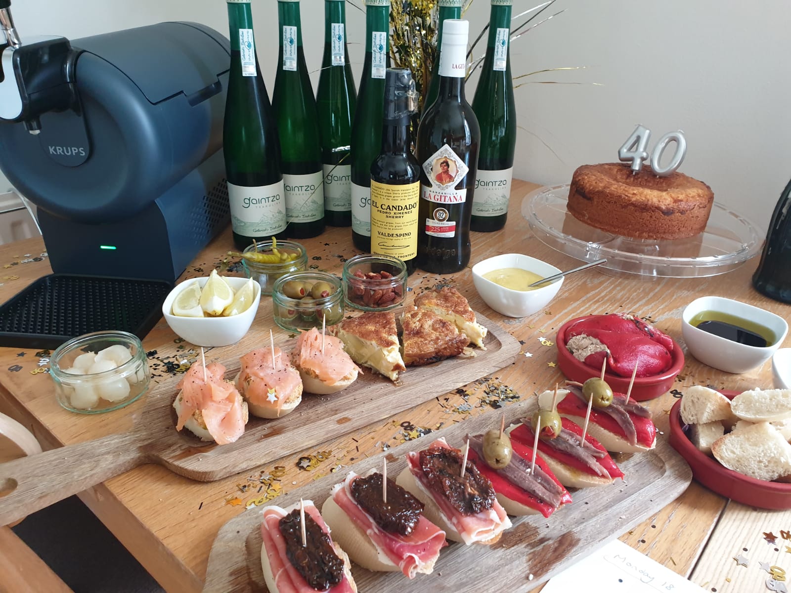 Still, if I couldn’t go to San Sebastian then San Sebastian would, apparently, come to me, and although we couldn’t go far, a kitchen in a small corner of Yorkshire was, for a couple of days (after such mammoth preparation the celebratory decorations weren’t coming down in a hurry) turned into a particularly well-stocked San Sebastian pinxtos bar. (Note the new Beer Sub thing on the left.)