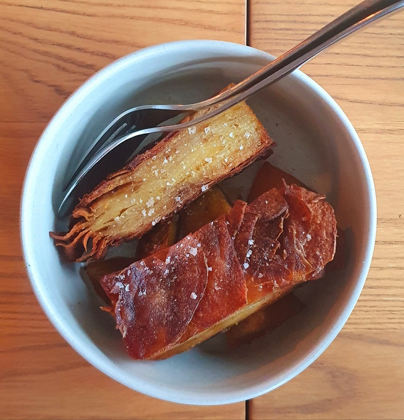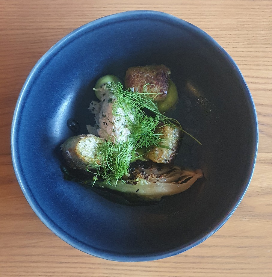 I like that the homemade bread here is old-school, pillow-crumbed, baguette – oven warm – and that the lightly Marmite’d butter it comes with stakes its claim as pretender to the beef dripping throne, which is surely the holy grail of bread spreadables. There are snacky profiteroles – moreish mouthfuls of wispy pastry smeared in sharp, tangy goat’s cheese and anointed with amber honey – that arrive alongside. And I can tell I’m rusty ‘cos in Normal Times these would be down-in-one jobs, but tonight I nibble demurely.