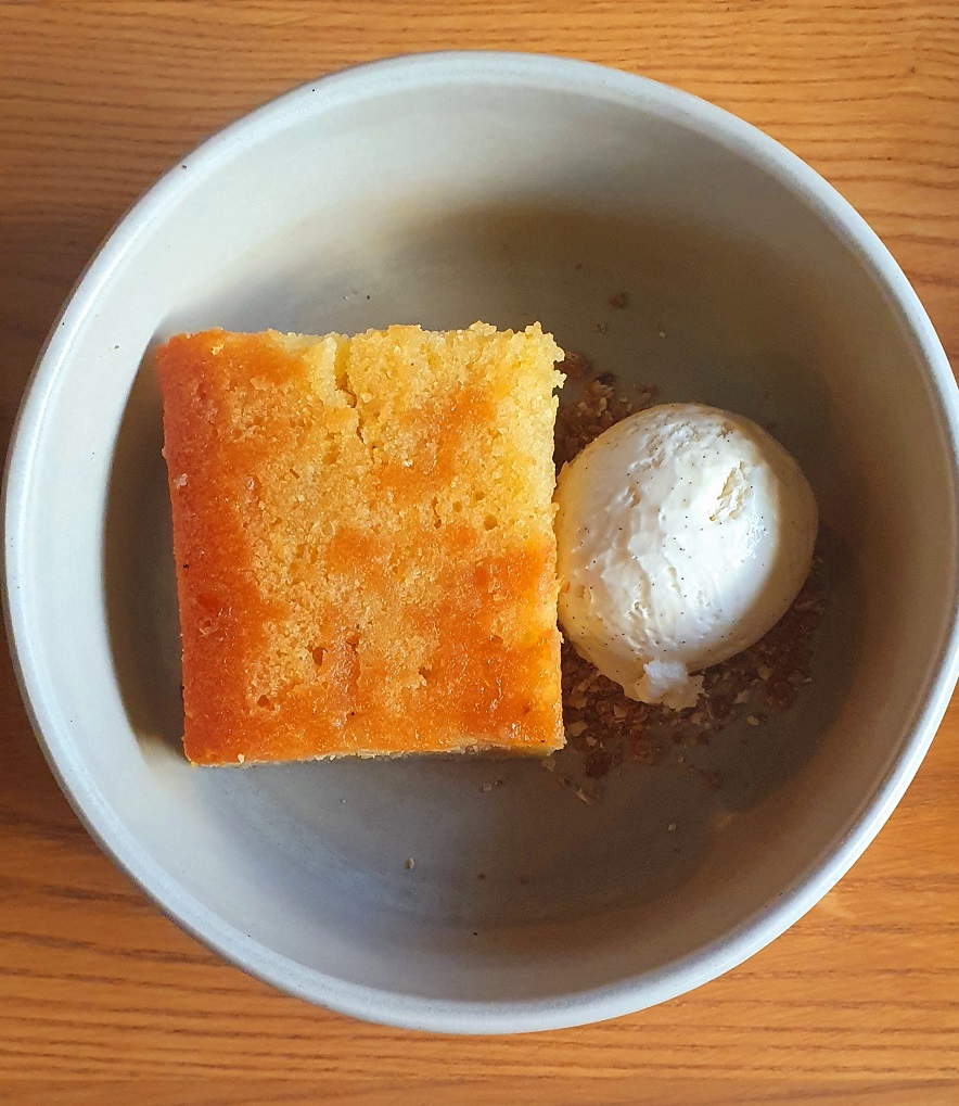 We do puddings primarily because Brook’s is a nice place to be but also, let’s face it, because we’ve currently got ‘nowt else to do after this but go home and watch more Taskmaster. And I like the simplicity, the no-pissing-about-ness of a chocolate and coffee torte and an orange olive oil cake; both served warm to make the accompanying ice-cream the best melty version of itself.