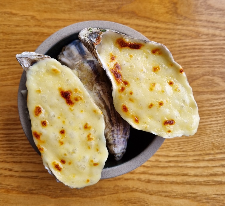 Ordinarily I prefer oysters just as they come, which is to say unembellished, especially when they presumably haven’t travelled very far so will be ultra-fresh. But a wodge of melted cheese is rarely to be frowned upon, and the minerally mollusc with its covering of bronzed dairy fat is a happy down-in-one mouthful.