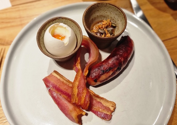 The breakfast buffet with its DIY toaster has long gone. In its place comes a well-paced series of good things (and they really are Good Things) to get the day off to a sturdy start. Bleary of eye, we get amongst yoghurt with freshly baked pastries, followed by a slither of superb salmon before the first-rate porky bits we were all really hanging on for.