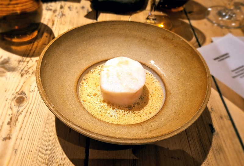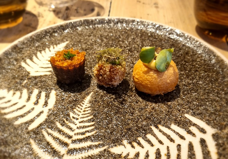 There are two menu options in the evening: four courses or eight. Knowing that prior to either there’d be snacks designed to shovel down in one go, and that we could chuck in some cheese, and that I should really limit the time available in which she could neck fifteen-quid glasses of champagne, we (I) plumped for the shorter version.